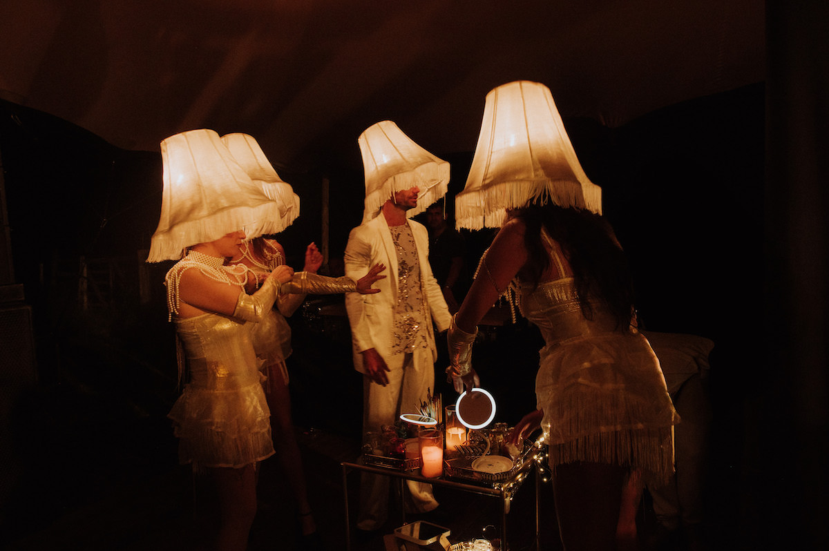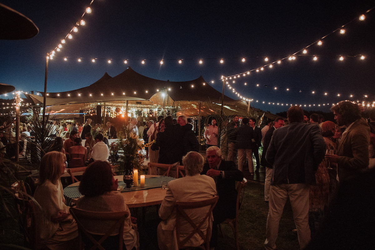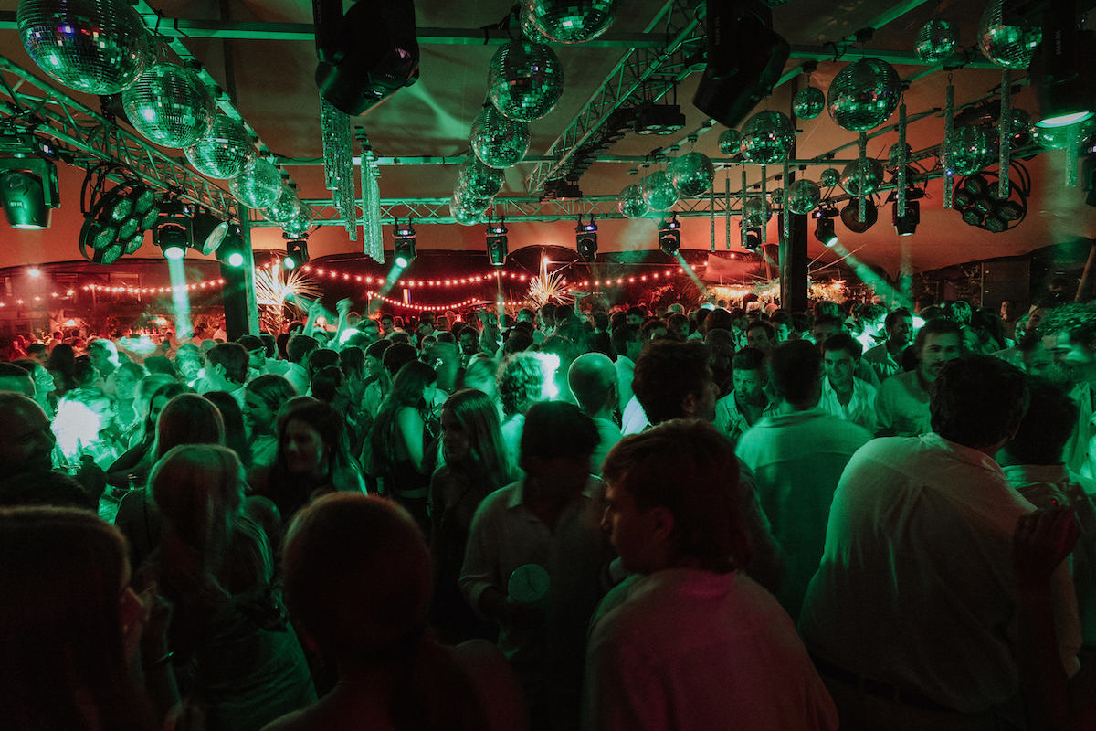 Cuando cayó la noche, la celebración se transformó. La pista de baile —intervenida con un techo de bolas de espejo y elementos reflectantes— amplificaba la luz y la energía en una atmósfera vibrante.