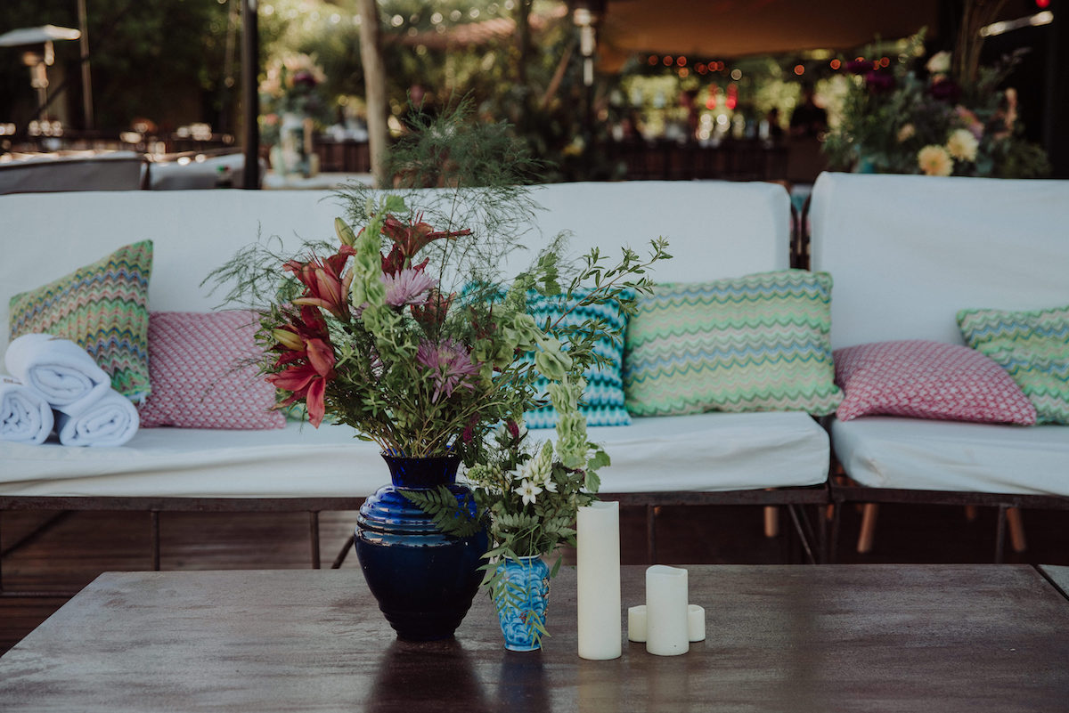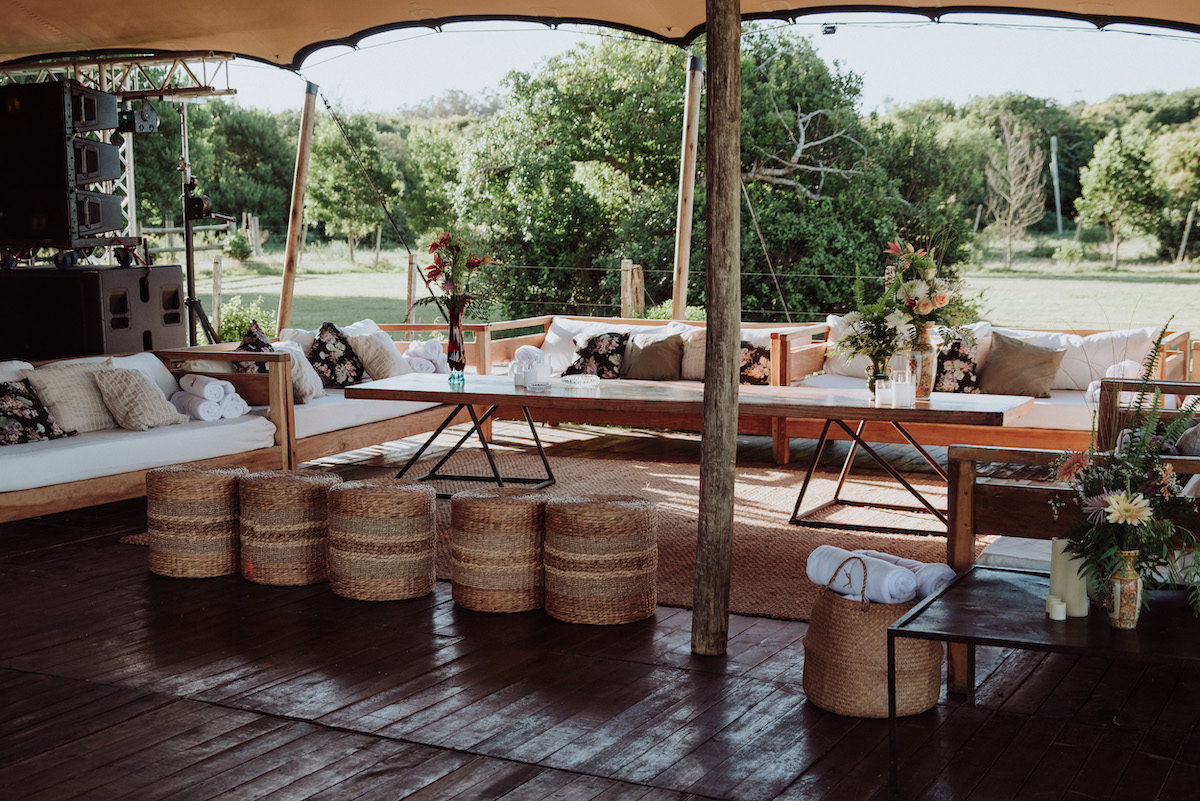 Los livings, tanto dentro como fuera de la carpa, proponían distintos modos de habitar la fiesta: sillones de madera con almohadones estampados especialmente diseñados, guiños textiles inspirados en motivos florales y estética Missoni, y sectores más descontracturados con hierro y mesas altas.
