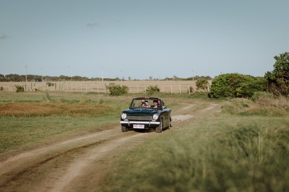 Con el atardecer cayendo sobre la Laguna Garzón, Delfina Guerra hizo su entrada acompañada por su padre, Martín Guerra, en una escena tan íntima como cinematográfica. Minutos antes, había llegado a la chacra “El Barco”, en un auto antiguo.