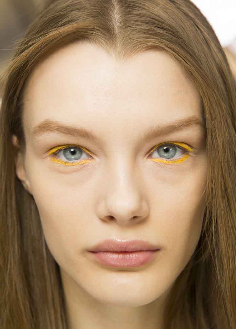 4.     Delineados Pantone: Pantone propone una paleta nueva por temporada. Lucir estos colores en delineados gruesos y plenos es otra de las importantes propuestas para este año. Dior, una de las firmas más referentes en maquillaje, la implementó en su última pasarela como vemos en la imagen abajo. Llevar un tono similar al de nuestros ojos o del opuesto complementario, puede resaltar significativamente la mirada.