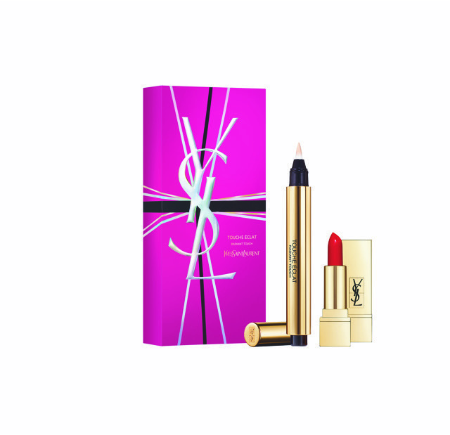 Set de maquillaje imperdible que incluye el famoso corrector Touche Eclat y labial en rojo pasión.